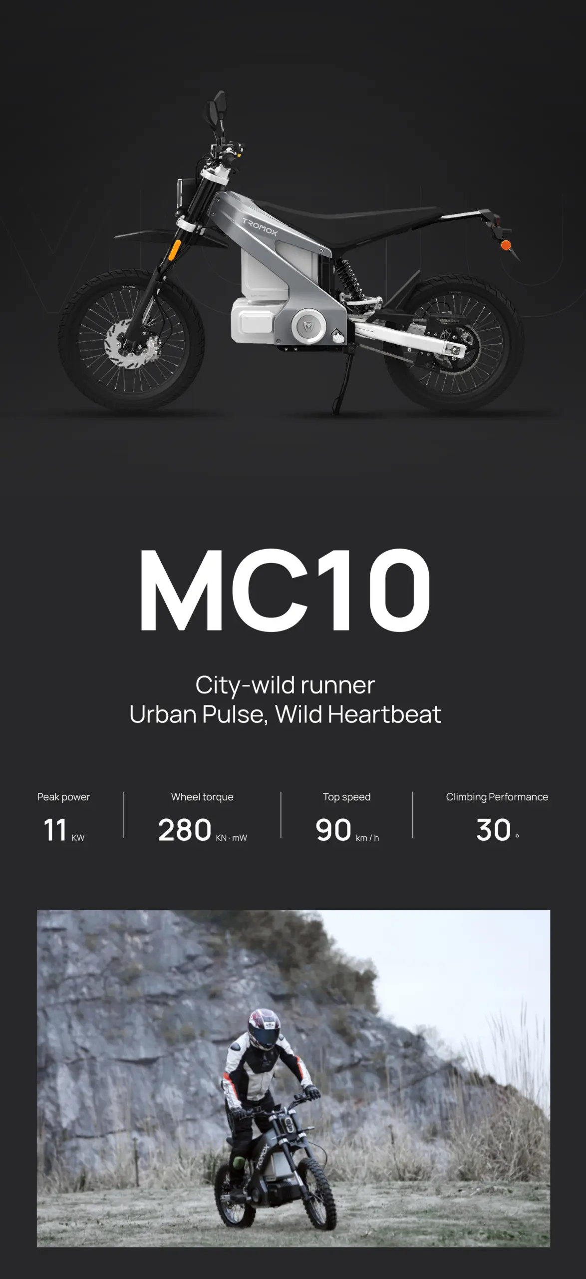 At its core, the mc10 is built for performance. Its mid-mounted motor delivers a peak power of 10kW and an impressive torque of 280N·m. Paired with a 72V30Ah battery system, it offers both range and reliability. For those seeking even more endurance, the dual battery option is a game-changer.